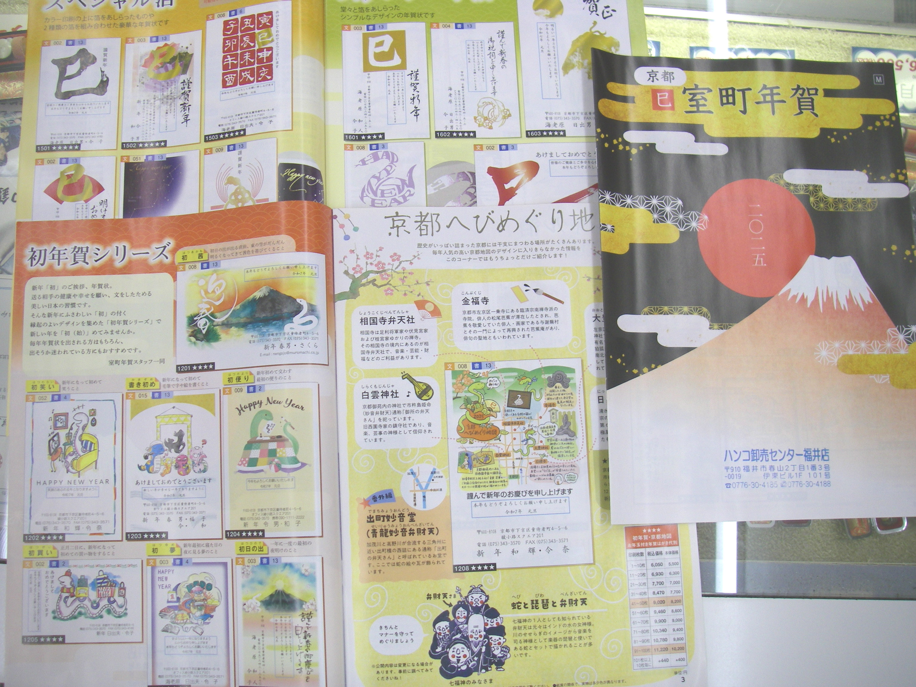 早くも11月となり、年賀はがきが発売となりました。当店でも年賀状印刷の受付をしております。今年も冊子型のカタログをご用意しております。伝統的な絵柄、箔押しの豪華なもの、ビジネス用、斬新なデザイン、心温まるようなかわいいもの、リーズナブルなものなど幅広く揃っておりますので、是非冊子を手にとって御覧下さい。